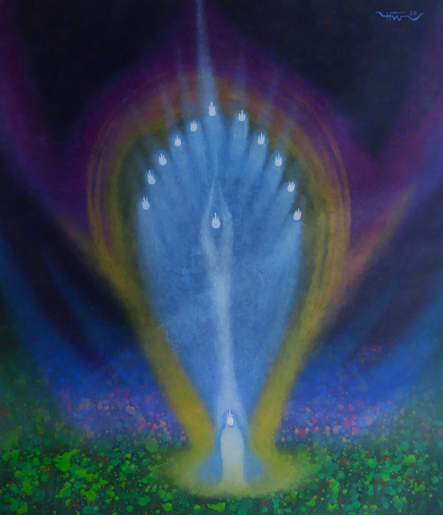 Во сликата „Времето – сите“ можеби најмистичното дело на оваа изложба, гледаме вистинска проекција на Вечноста. Ништо нема да биде изгубено и сите ќе бидеме едно во аурата на светлината. Чудесно небесно тело кое потсеќа на сонцето, но не е, се издига над фигурата во полето. Не е сонце затоа што светлината на Тој е поголема од сонцето, затоа што таа светлина не заоѓа никогаш. „Јас сум светлината на светот!“ За разлика од историското време, во времето содржано во огромниот небесен ореол полн со преобразени човечки фигури над кои блеска светлината на божјиот пламен, нема минливост. Нема смрт. Во историското време, тешка е судбината човекот. Но, посебна е тежината на модерниот човек во урбаната цивилизација: тој се движи брзо напред, но не напредува. Технолошката еволуција не е во склад со човечкиот напредок. Секој чекор изгледа ист како претходниот. Заталкани сме во бесконечен лавиринт на очекувањето. Ги нема свеќите кои ја осветлија темнината. „Ако светлината која е во вас стане темнина, тогаш колкава ли би била темнината?!“ им кажа Христос на апостолите.
